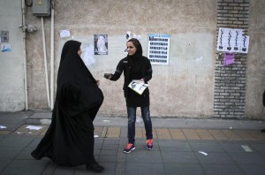 (160225) — TEHRAN, Feb. 25, 2016 (Xinhua) — A woman distributes electoral posters in downtown Tehran, Iran, on Feb. 24, 2016. Iranians will participate in both the Parliamentary election as well as that of the Assembly of Experts on Feb. 26.