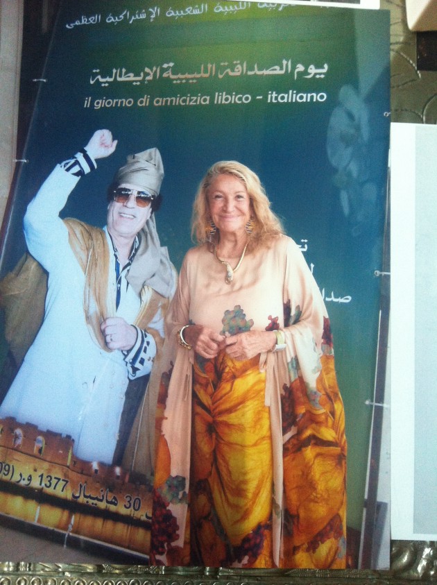 Appeso al muro ti sorride Gheddafi, di cui non hai mai rinnegato la sincera amicizia. Ma sono tutte comparse, tu, da grande burattinaia, dal cesto impagliato sembri incrociarne i fili. “Vado, vengo e non mi trattengo”, è uno dei tuoi aforismi preferiti. E ti riferisci a Cortina dove Stefano e Riccarda Contini, i tuoi amici galleristi, ti hanno fatto un surprise party nel loro chalet. E che sorpresa!