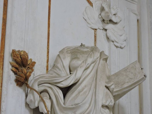 Le teste appartengono all’apparato decorativo che si trova all’interno della navata unica della chiesa ricostruita dalla Compagnia dei Tre Re a partire dal 1580 nel luogo nel quale era la Chiesa di San Giorgio lo Xheri. Apparato decorativo realizzato nel 1750 da Procoio e Giovanni Maria Serpotta, con il contributo di Gaspare Firriolo e Domenico Guastella. Due opere d’arte, mutilate, forse per gioco. Le quali si vanno ad aggiungere alle altre quattro che hanno subito la stessa sorte, qualche anno prima. Così la chiesa danneggiata dai bombardamenti e poi dall’abbandono e dall’incuria, proprietà dell’Istituto Autonomo Case popolari che ha provveduto almeno ad una sommaria “ripulitura”, ha subito l’ennesimo affronto. Neppure l’unico, considerando che l’umidità ha in più punti contribuito, lungo le pareti interne, al distaccamento dei rivestimenti. Ancora più gravemente compromessi gli affreschi superstiti. Soprattutto quelli che ricoprono la sottostante cripta alla cui areazione provvedono due aperture nel pavimento della chiesa e che costituiscono un pericolo, dal momento che la grata in ferro che ne assicura la chiusura ha un foro centrale, di proporzioni considerevoli. Insomma una pericolosa “trappola” per chi visita il monumento. Ma c’è dell’altro.