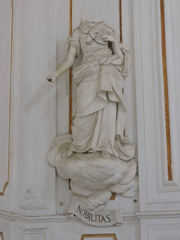 Un declino progressivo, inarrestabile, che ha coinvolto anche gli esterni dell’edificio. Così la facciata, progettata nella seconda metà del Settecento da Francesco Ferrigno è diventata poco più di una sagoma. Cadente. Prospettante su strade nelle quali a dominare sono rifiuti e automobili.