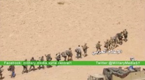 Soldiers march in a line at where the Syrian military media said is Palmyra, in this still image taken from a Syrian military media video uploaded on March 23, 2016, as Syrian government forces push their way into Palmyra while the army attempts to recapture the historic city from Islamic State. REUTERS/Syrian Military Media via Reuters TV ATTENTION EDITORS – THIS PICTURE WAS PROVIDED BY A THIRD PARTY. REUTERS IS UNABLE TO INDEPENDENTLY VERIFY THE AUTHENTICITY, CONTENT, LOCATION OR DATE OF THIS IMAGE. EDITORIAL USE ONLY. NOT FOR SALE FOR MARKETING OR ADVERTISING CAMPAIGNS. NO RESALES. NO ARCHIVE. THIS PICTURE IS DISTRIBUTED EXACTLY AS RECEIVED BY REUTERS, AS A SERVICE TO CLIENTS.