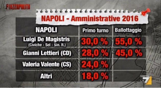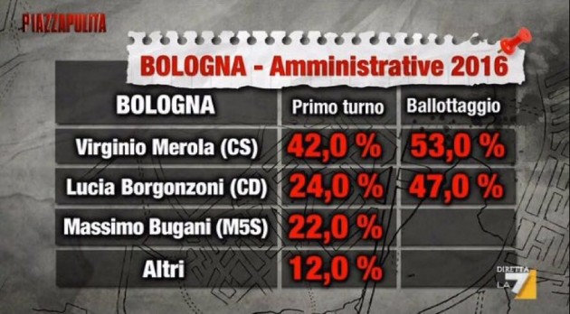 A Bologna già al primo turno il primo cittadino Virginio Merola sfiora il 42% e stacca di 18 punti la candidata del centrodestra Lucia Borgonzoni che al ballottaggio arriva al 47% contro il 53 di Merola. Massimo Bugani dei 5 Stelle si ferma al primo turno col 22%. Infine, a Napoli, il sindaco in carica Luigi De Magistris (liste civiche – Sel- Sinistra italiana) al primo turno stacca di soli due punti il candidato del centrodestra Gianni Lettieri (30 a 28). Una distanza che al ballottaggio arriva a dieci punti percentuali (55 a 45). Valeria Valente, invece – che alle primarie Pd di Napoli ha battuto Antonio Bassolino – si ferma al primo turno col 24%.