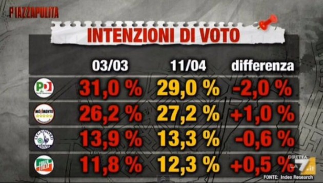 Il Pd cala di due punti e rimane il primo partito, mentre il Movimento 5 Stelle – che sale dell’1% – lo segue a distanza di 1,8 punti. I sondaggi sulle intenzioni di voto diffusi da Piazzapulita (La7), che prendono in considerazione il periodo dal 3 marzo all’11 aprile, vedono al terzo posto la Lega, che perde lo 0,6 e passa da 13,9 a 13,3, e infine Forza Italia che guadagna mezzo punto percentuale, salendo da 11,8 a 12,3. I dem passano da 31 a 29%, mentre i Cinque stelle dal 26,2 salgono al 27,2%.