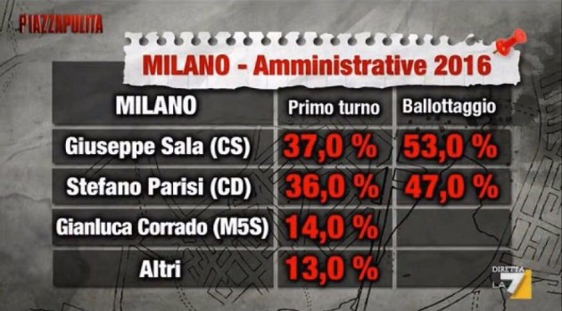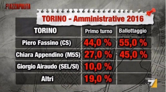 A Milano, invece, è in vantaggio al primo turno con 37 punti il candidato di centrosinistra Giuseppe Sala. Un vantaggio che, però, è di misura, visto che Stefano Parisi (centrodestra) si ferma a 36. Diverso il quadro dei ballottaggi, dove l’ ex commissario unico e amministratore delegato di Expo 2015 vince col 53% dei voti, mentre Parisi si ferma a 47. Gianluca Corrado, candidato M5s dopo il ritiro di Patrizia Bedori, si ferma al 14%. Forbice più ampia al primo turno, invece, a Torino, dove Piero Fassino – candidato del centrosinistra – arriva al 44% contro il 27 di Chiara Appendino dei 5 Stelle. Giorgio Airaudo (Sinistra Italiana-Sel) si ferma al 10 e al secondo turno l’attuale sindaco vince col 55% dei voti, contro il 45 dell’esponente Cinque Stelle.