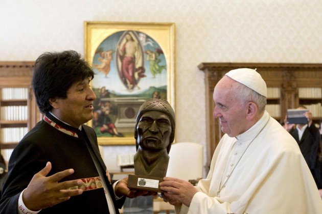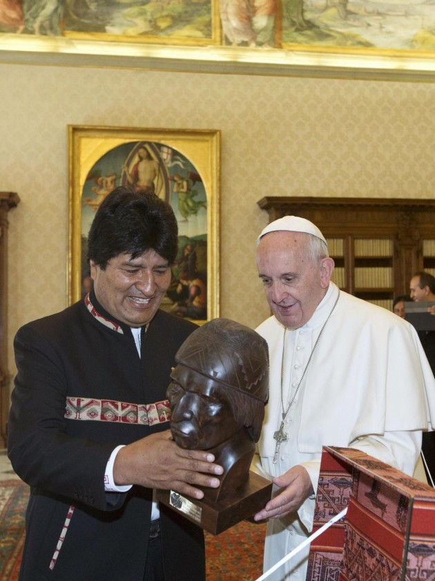 I tre volumi sono stati dati al pontefice dopo la consegna di altri doni. Il primo, contenuto in una grande scatola rivestita con disegni e colori di impronta indigena, era un busto in legno di Tupac Katari, leader indigeno (1750-1781), capo aymara di una delle più significative rivolte indigene contro le autorità coloniali nell’Alto Perù, l’attuale Bolivia, che fu torturato e ucciso per squartamento. Quindi Morales ha dato al Papa una cartella con dentro dei documenti, tirandone fuori uno in particolare: “Qui c’è una letterina che le mandano i Movimenti Popolari“, ha detto, con riferimento al loro incontro mondiale dove il Papa intervenne nel luglio dell’anno scorso proprio in Bolivia, a Santa Cruz de la Sierra.