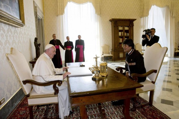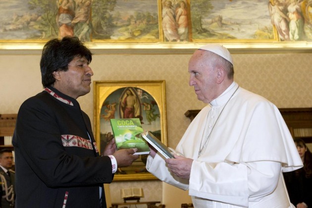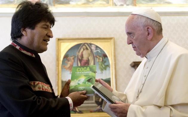 A luglio gli aveva regalato un crocifisso a forma di falce e martello. Ma questa volta il presidente della Bolivia Evo Morales, arrivato in Vaticano, ha regalato a Papa Francesco tre libri sulla coca. I titoli: “Coca, una bio-banca“, “Coca, dieta citogenica“, “Coca, fattore anti-obesità“. Bergoglio li ha presi e ha ringraziato. Poi Morales, parlando della bevanda tradizionale fatta con le foglie di coca (mate de coca) ha detto: “Io la prendo e mi fa molto bene. Gliela raccomando. Così ce la fa per tutta la vita”.