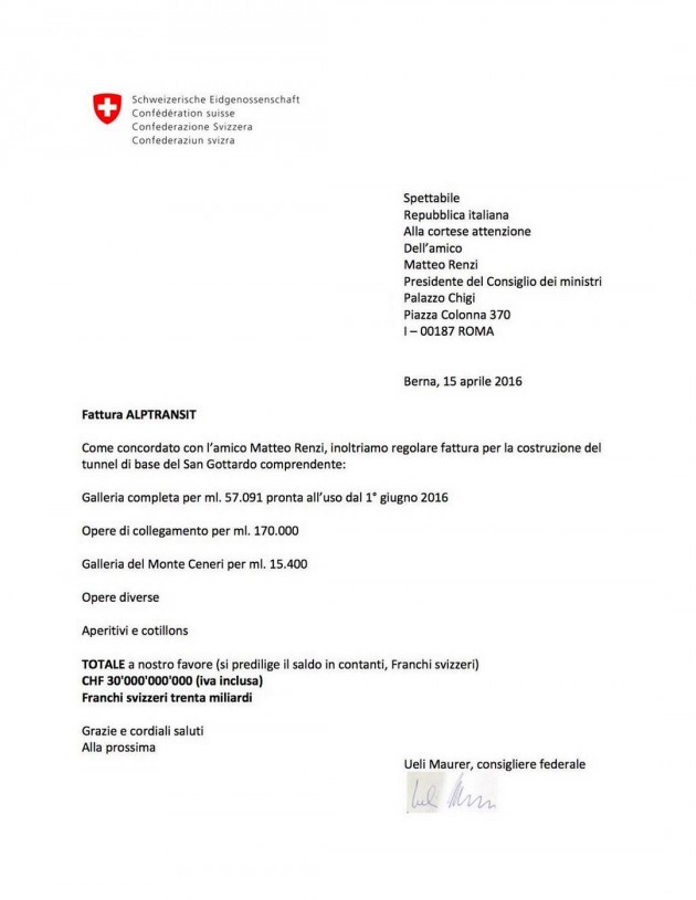 Il giornalista ticinese Enzo Rocchi Balbi su twitter ha postato l’immagine di una lettera (finta) con la firma del consigliere federale Ueli Maurer, l’omologo svizzero del ministro delle finanze, che presenta il conto a Renzi: “Scusi presidente – scrive il giornalista -, ma gli svizzeri lamenterebbero un’insolvenza…” . Il collega della RSI (la tv di stato elvetica) Antonio Civile liquida tutto con una battuta: “Dai lo sanno tutti che il Gottardo unisce l’Italia alla Germania”.