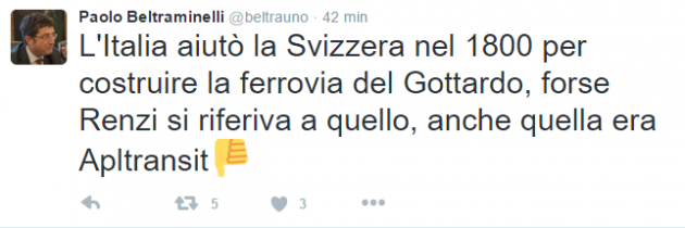 Anche il consigliere di Stato Norman Gobbi (Lega dei Ticinesi) ha affidato il commento al suo profilo facebook: “Matteo Renzi stava scherzando sui meriti italiani per Alptransit Gottardo, intendeva i grandi successi italiani sulla Stabio-Arcisate!”. Insomma, lo irride e mette il dito nella piaga, corredando il tutto con l’immagine aerea della ferrovia Arcisate-Stabio in costruzione tra la provincia di Varese e il Canton Ticino. Una foto da cui si vede in maniera lampante come la parte di competenza svizzera sia stata completa da tempo e quella italiana è ancora ben al di là dall’essere terminata. Critiche al premier arrivano anche dal Partito popolare democratico svizzero. Paolo Beltraminelli ha twittato un pollice verso accompagnando il gesto di disappunto con una frase: “L’Italia aiutò la Svizzera nel 1800 per costruire la ferrovia del Gottardo, forse Renzi si riferiva a quello, anche quella era Apltransit”.