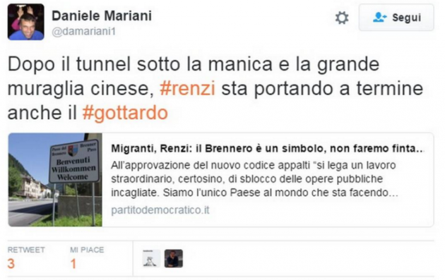 Dopo i neutrini dell’ex ministro Mariastella Gelmini pensavamo di averle sentite tutte. Eppure, restando in tema di gallerie italo-elvetiche, il premier Matteo Renzi è riuscito a far di meglio. Si è preso il merito della realizzazione della galleria di base del San Gottardo. Una gaffe clamorosa che ha scatenato l’ironia e il sarcasmo di politici e dei giornalisti svizzeri.