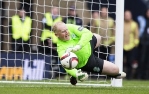Hibernian Conrad Logan saves the second penalty in the penalty shoot out during the William Hill Scottish Cup semi-final match at Hampden Park, Glasgow. PRESS ASSOCIATION Photo. Picture date: Saturday April 16, 2016. See PA story SOCCER Glasgow. Photo credit should read: Jeff Holmes/PA Wire. EDITORIAL USE ONLY