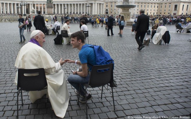 Una giornata pop per Papa Francesco. Dalle confessioni in piazza San Pietro con i giovani ai selfie con i cantanti che animeranno il Giubileo dei ragazzi, alla torta con san Giorgio fino al duetto con Iva Zanicchi su un inedito arrangiamento del Padre nostro. Per il suo quarto onomastico da Papa Bergoglio ha rotto nuovamente ogni protocollo e con una semplice stola viola sulla sua talare bianca ha raggiunto piazza San Pietro a piedi e si è messo a confessare per oltre un’ora 16 giovani, fra i 13 e i 16 anni, che sono arrivati a Roma da diversi parti d’Italia e del mondo per celebrare il loro Giubileo. Nessun confessionale speciale per Francesco ma una semplice sedia di plastica come quelle utilizzate dagli altri 150 sacerdoti presenti in piazza per amministrare ai ragazzi il sacramento della riconciliazione.