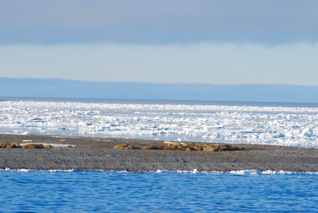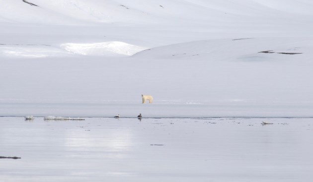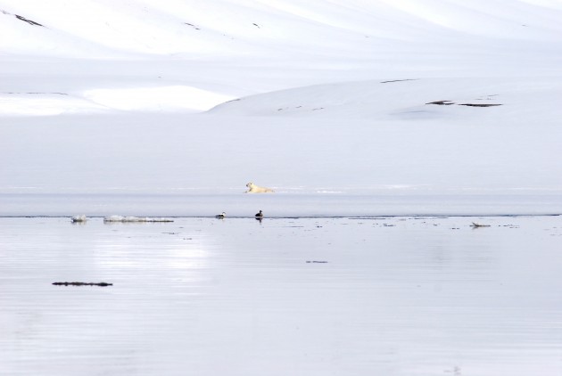 E gli animali? Vista dalla nave una colonia di trichechi, una specie di folla da derby calcistico, pacificamente stesi sull’isola di Moffen, che è quella che sta poco oltre la linea dell’80° parallelo. Poi una balena al largo che sbuffava. E finalmente un orso. Uno solo. Però bellissimo, candido nella neve candida, plastico nei movimenti, una figura perfetta. Era sdraiato, si è accorto della nostra presenza, si è alzato lentamente e si è messo a guardarci, il corpo in una posizione, la testa girata verso di noi. Come le statue che vendono nei negozi di souvenir. Però uno solo. Funziona così con la fauna, questione di fortuna. Da queste parti gli orsi sono come i piccioni a Venezia. Ma in fondo averne visto solo uno ha fatto diventare magico l’incontro.