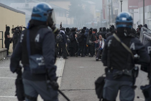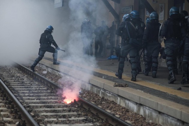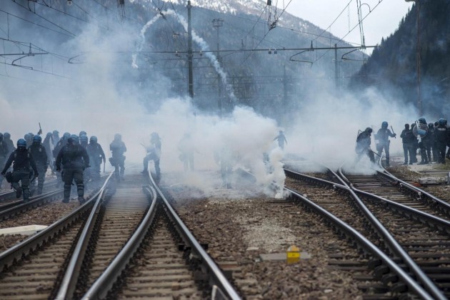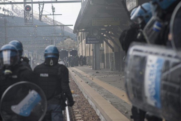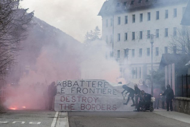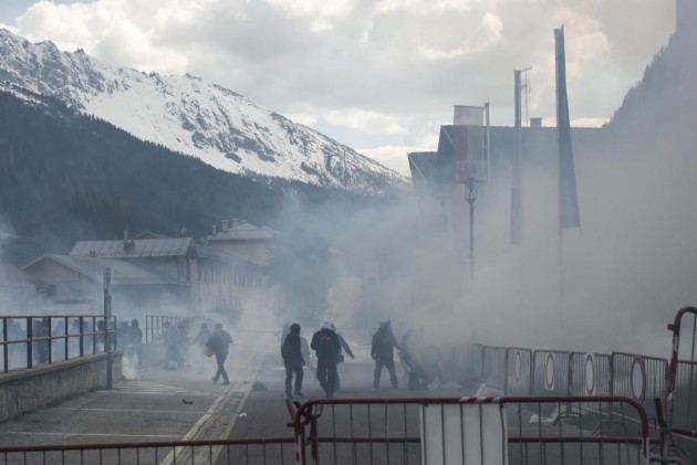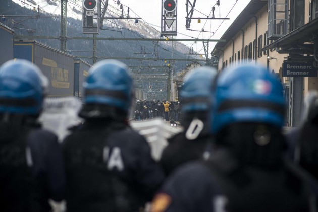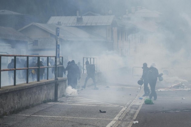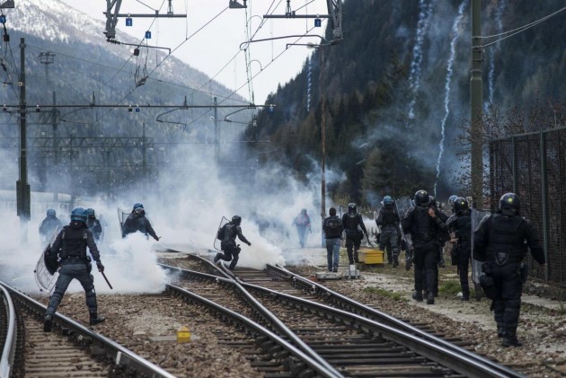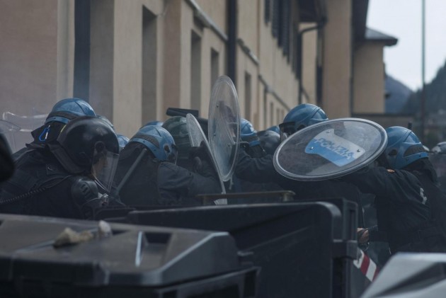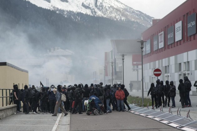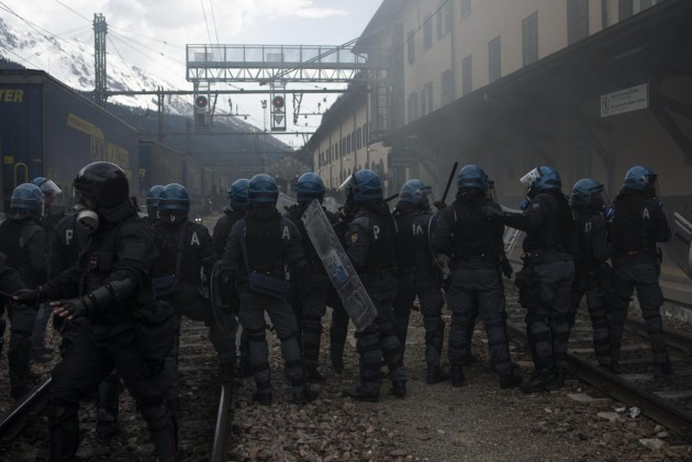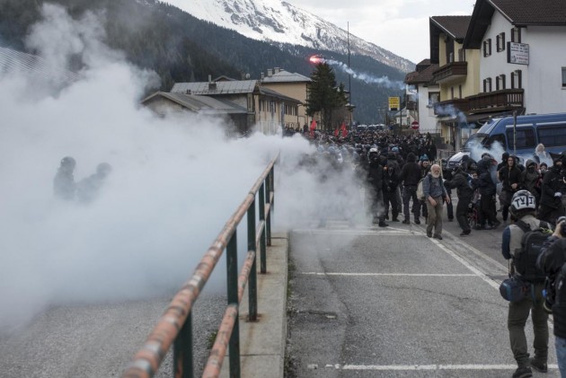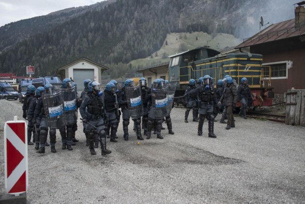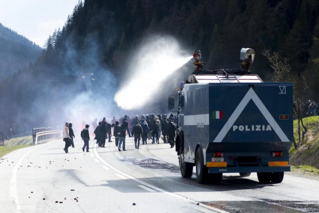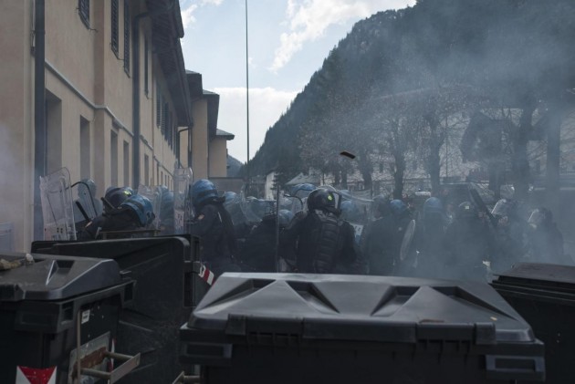 Appena i manifestanti sono usciti dalla stazione, molti di loro con volto coperto e vestiti di nero, hanno gridato slogan contro poliziotti e si sono scagliati contro giornalisti e fotografi lungo la via principale del paese. Poi il corteo ha iniziato a muoversi verso il confine austriaco, intorno alle 14 e 30. Gli scontri sono scoppiati immediatamente. La manifestazione si è divisa in due tronconi. Il primo ha cercato di abbattere le transenne che le forze dell’ordine avevano allestito per evitare che i dimostranti giungessero sulla sedia ferroviaria. A quel punto gli antagonisti hanno lanciato bengala, petardi e sassi. La polizia ha risposto con i lacrimogeni.