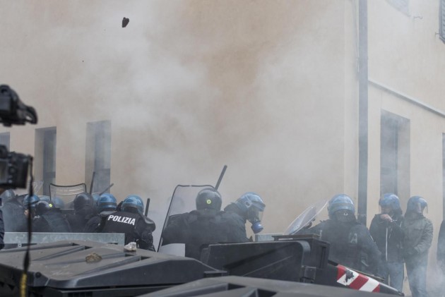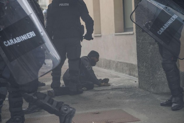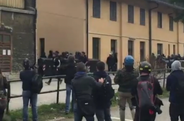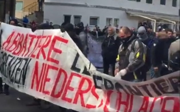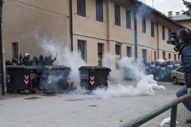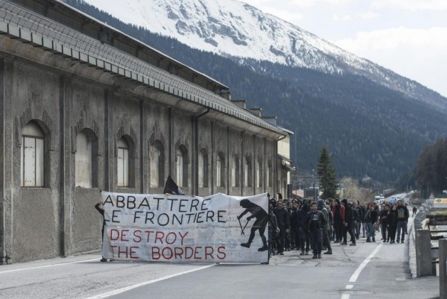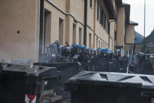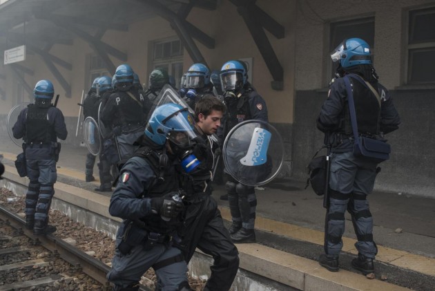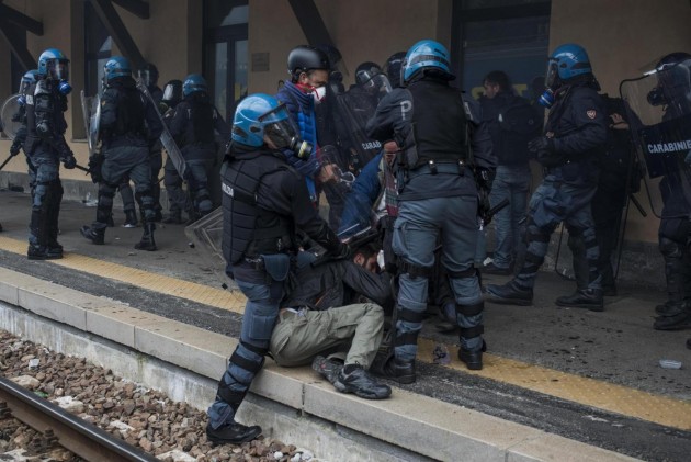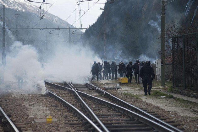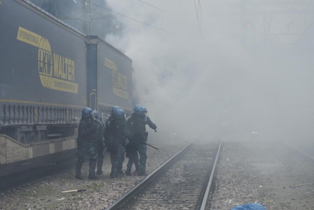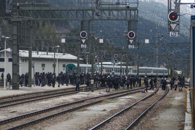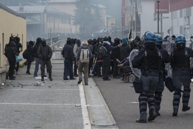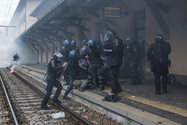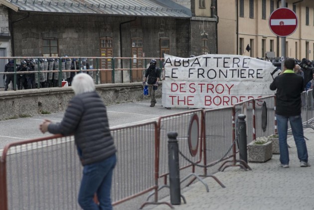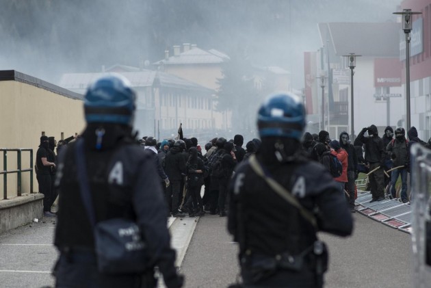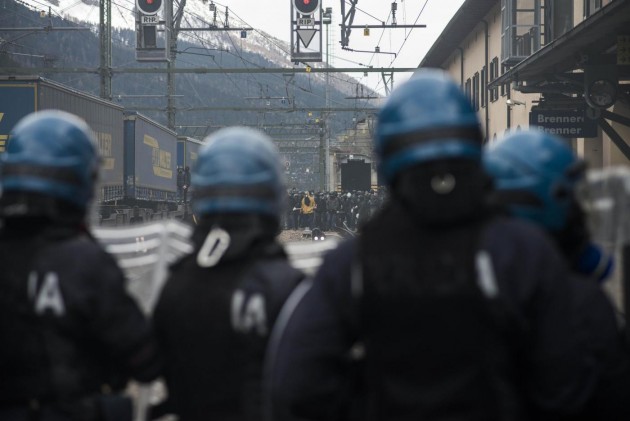 Appena i manifestanti sono usciti dalla stazione, molti di loro con volto coperto e vestiti di nero, hanno gridato slogan contro poliziotti e si sono scagliati contro giornalisti e fotografi lungo la via principale del paese. Poi il corteo ha iniziato a muoversi verso il confine austriaco, intorno alle 14 e 30. Gli scontri sono scoppiati immediatamente. La manifestazione si è divisa in due tronconi. Il primo ha cercato di abbattere le transenne che le forze dell’ordine avevano allestito per evitare che i dimostranti giungessero sulla sedia ferroviaria. A quel punto gli antagonisti hanno lanciato bengala, petardi e sassi. La polizia ha risposto con i lacrimogeni.