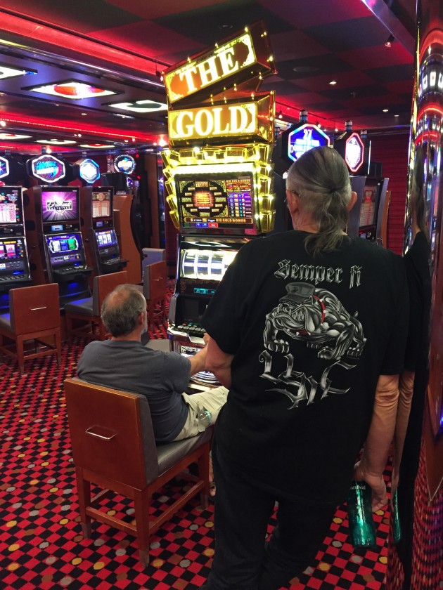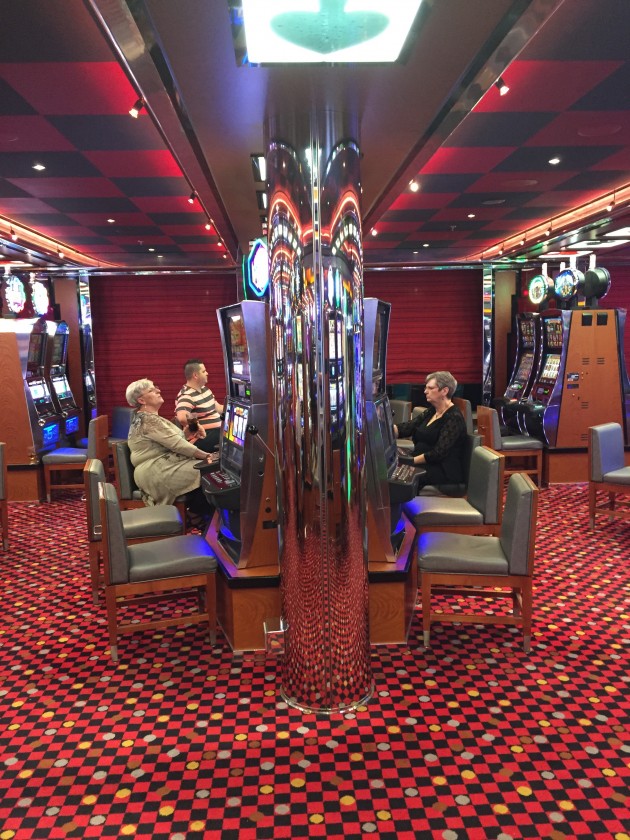 A bordo tutto ricomincia. Il pomeriggio ha le caratteristiche della mattinata. La cena le caratteristiche del pranzo. La sera no, è diversa. Non hai una città da visitare, posti dove andare, ma solo il tuo piccolo luccicante villaggio che accende tutti i suoi neon. Milioni di neon. Sembrano ispirate a Las Vegas, le grandi navi, studiate dagli architetti e dai decoratori dei casinò. Luci, colori, un po’ di kitsch qua e là. E la sera è un incessante via vai fra un ponte e l’altro, un teatro e l’altro, un concerto di un pianista intimo che suona Chopin (evento raro relegato in un angolo nascosto) e uno spettacolo stile Broadway (evento meno raro, di livello appena più basso, perché quelli di Broadway di solito stanno a Broadway). Oppure da una discoteca all’altra. Che sono quelle tradizionali, magari con la differenza dell’età media dei partecipanti ai balli. Tutto gratuito, naturalmente. Bevande escluse.