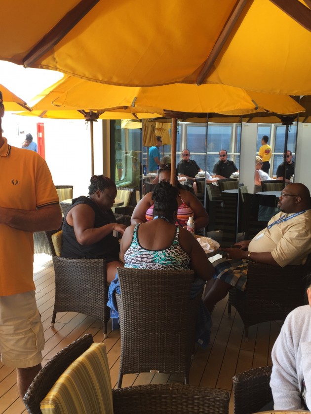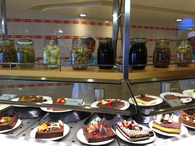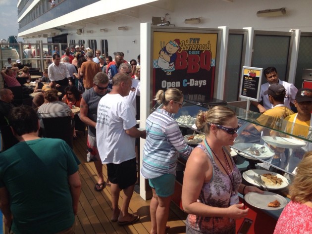 Si può mangiare sempre, in crociera. A ogni ora del giorno e della notte. Senza nemmeno disturbare il servizio in camera. Cominci al mattino presto con la prima colazione. Devi condividerla ovviamente con altre centinaia di persone. Allora si va di fretta nella sala. Obiettivo: occupare i posti migliori. Per esempio davanti alla vetrata che dà sul mare o il tavolo più vicino al buffet. Il buffet è quanto di più spettacolare si possa immaginare. Una fila infinita di “postazioni”, punti di approvvigionamento in cui puoi trovare tutto l’edibile del mondo. Dal banale eggs and bacon fino alle ostriche. Ogni tipo di frutta, ogni tipo di dolce. Come nel ristorante di un grande albergo, solo ancora più grande, più affollato e più frenetico. Sarà l’aria di mare, ma il crocierista-tipo sembra più affamato dell’ospite di un hotel. Finita la colazione si va alla ricerca del luogo dove attendere il pranzo. Il bordo piscina (di una delle piscine) o il ponte prendisole. Oppure del modo in cui ammazzare il tempo in attesa del pranzo. Un trattamento nella beauty farm, un giro in palestra, un corso di ballo, un corso di piegamento degli asciugamani, la lezione di un nutrizionista. Un ossimoro, qui. Il nutrizionista sta alla crociera come gli sci stanno a un delfino. Se si è in navigazione in acque internazionali il casinò è già aperto. Il problema è che 6.300 persone non ci stanno sul bordo piscina e neppure sul ponte prendisole, dove i lettini saranno sì e no qualche centinaia e se capiti male il mare lo intravedi “filtrato” da piani continui di seminudità umane unte di crema solare. Insomma, ci si deve distribuire. Se la distribuzione naturale non funziona, sono guai.