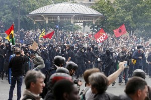Masked youths with labour union flags are seen during clashes with French gendarmes and riot police during a demonstration in protest of the government’s proposed labor law reforms in Paris, France, May 26, 2016. REUTERS/Charles Platiau