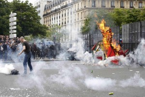 Tear gas fills the air during clashes with French gendarmes and riot police during a demonstration in protest of the government’s proposed labour law reforms in Paris, France, May 26, 2016. REUTERS/Charles Platiau