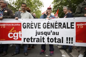 French labour union members march during a demonstration in protest of the government’s proposed labour law reforms in Paris, France, May 26, 2016. Banner reads, "General Strike until the law reform proposal is withdrawn". REUTERS/Charles Platiau