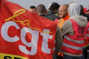 Striking French CGT labour union employees stand near a barricade to block the entrance of the fuel depot of the SFDM company near the oil refinery of Donges, France, May 25, 2016 in protest over proposed new labour laws. REUTERS/Stephane Mahe