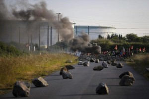 French union workers and protestors stand near a burning barricade to block the entrance of the fuel depot of the SFDM company near the oil refinery of Donges, France, May 25, 2016 over proposed new labour laws. REUTERS/Stephane Mahe