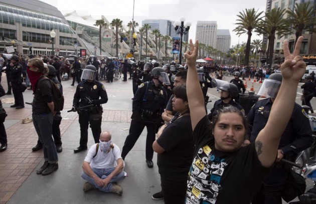 Conquistati i delegati per la nomination repubblicana tra l’indignazione generale Donald Trump ha tenuto il suo comizio a San Diego (California), in vista delle primarie del 7 giugno per cui il miliardario è ormai unico candidato, mentre fuori al centro convegni della città c’erano disordini e scontri tra manifestanti, pro e contro, e la polizia. Erano circa mille i dimostranti contro il miliardario che aspira alla Casa e alla fine sono state 35 le persone arrestate.