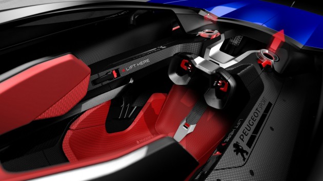 Dimensioni e pesi sono estremi: un metro di altezza per una tonnellata di peso, spinta da un’unità motrice ibrida plug-in; quest’ultima è strettamente derivata dalla 308 R HYbrid, recente show-car a trazione integrale con discrete possibilità di produzione in serie. Parliamo di un cuore a 4 cilindri 1.6 turbo da 270 CV abbinato a 2 motori elettrici: la potenza complessiva raggiunge 500 CV, buoni per sparare la monoposto L500 R HYbrid da 0 a 100 km/h in 2,5 secondi. Mentre all’interno il cruscotto “i-Cockpit” evoluto proietta gli ologrammi relativi alle informazioni di guida nel campo visivo del pilota; e chi si trova al paddock può seguire le evoluzioni di guida on-board tramite un casco per la realtà virtuale.