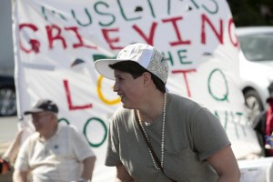 Jun 12, 2016; Nyack, NY, USA; A woman dances in front of a sign of support from the Muslim community at the Rockland Pride Day in Nyack in wake of the mass shooting at the Pulse nightclub in Orlando, Florida. Mandatory Credit: Ricky Flores/The Journal News via USA TODAY Network *** Please Use Credit from Credit Field *** Strage di Orlando, il dolore dei parenti, i soccoris, le vittime SIPA USALaPresse — Only Italy *** Local Caption *** 17777747