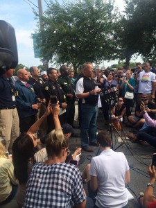 (160612) — ORLANDO, June 12, 2016 (Xinhua) — Photo provided by Orlando Police Department shows Orlando Mayor Buddy Dyer (C) speaks to the media about the Pulse nightclub shooting in Orlando, Florida, the United States, June 12, 2016. About 50 people were killed and 53 others wounded early Sunday morning in a shooting incident at a gay nightclub in Orlando, Florida, according to Orlando mayor. (Xinhua/Orlando Police Department) (djj)