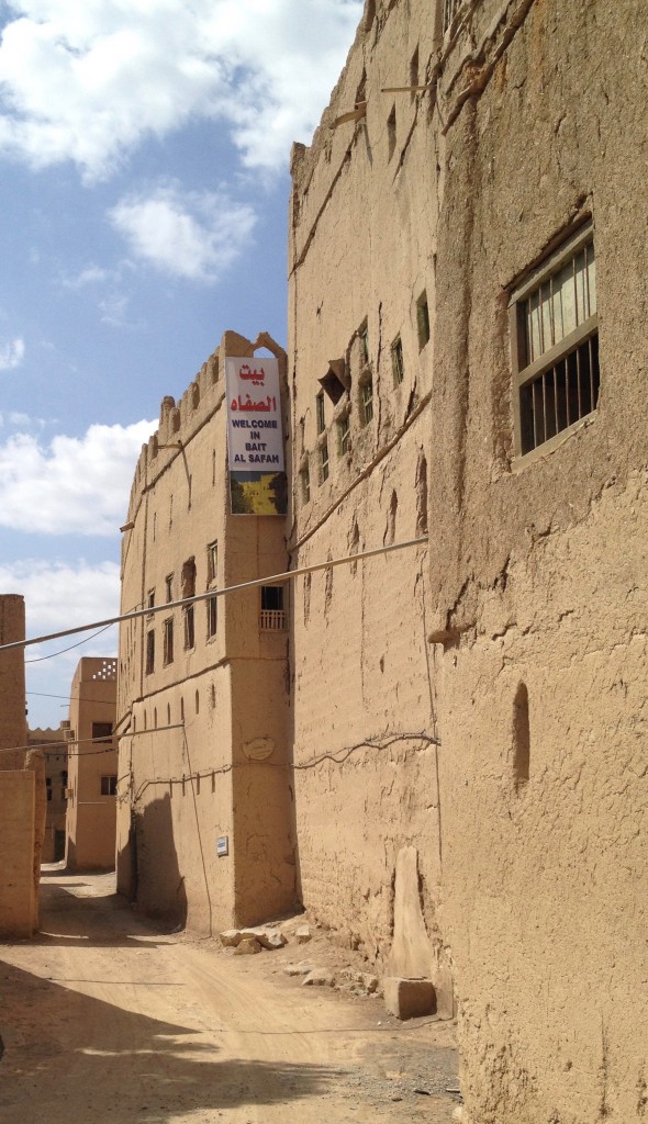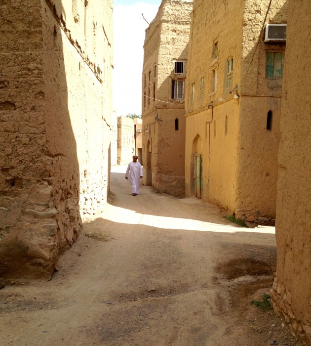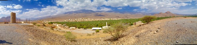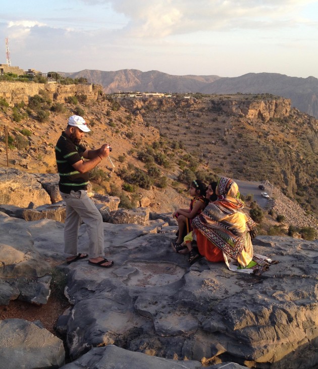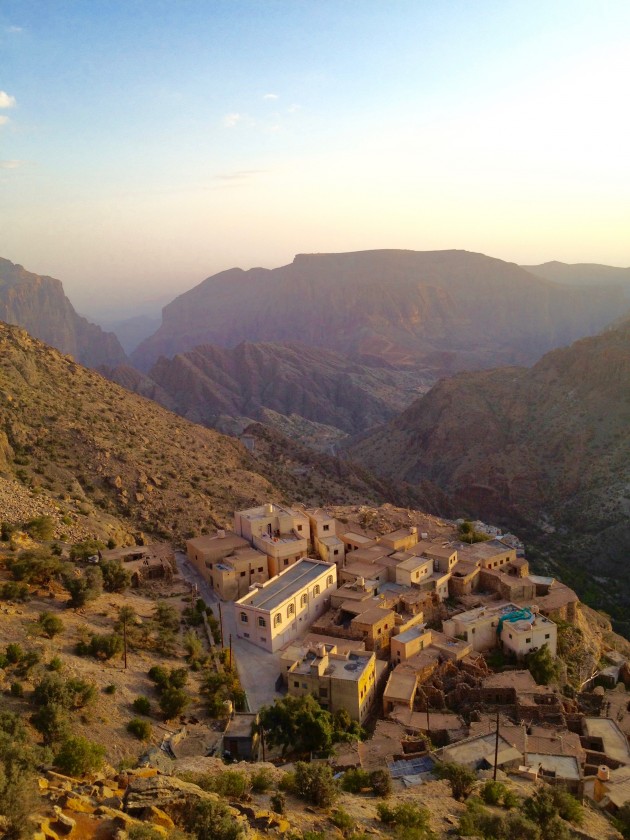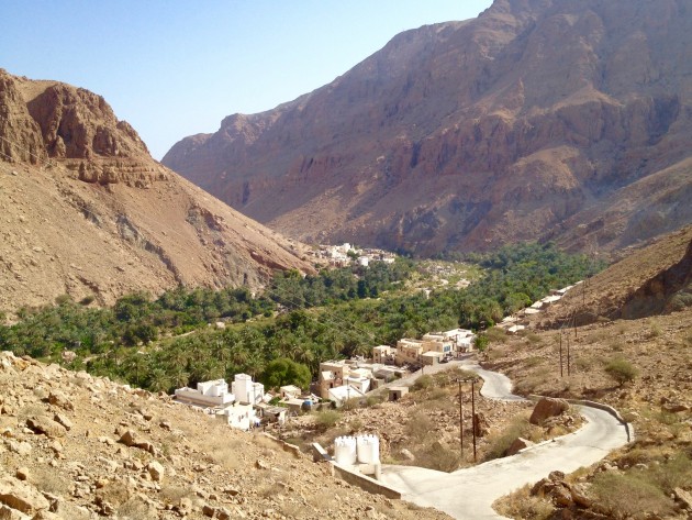 Poi le alture. Lasci Muscat e comincia a comparire una terra bruna che piano piano si alza, fino a diventare montagna. Una sosta o due per vedere un forte coloniale, sempre portoghese, ogni tanto un villaggetto sperduto. Un panorama grandioso, pietroso, larghi canyon, spuntoni, picchi, gole, qualche torrente, polvere. Al-Hamra è fatto di case di fango, le contadine sono a testa scoperta e portano abiti multicolori. I monti Al-Hajar, fra il Jebel Akhdar e il Jebel Shams, non scherzano: superano i 3.000 metri di altitudine. Freddo, anche un po’ di nebbia, un hotel che sembra un rifugio e intorno un paesaggio inquietante ma magnifico.