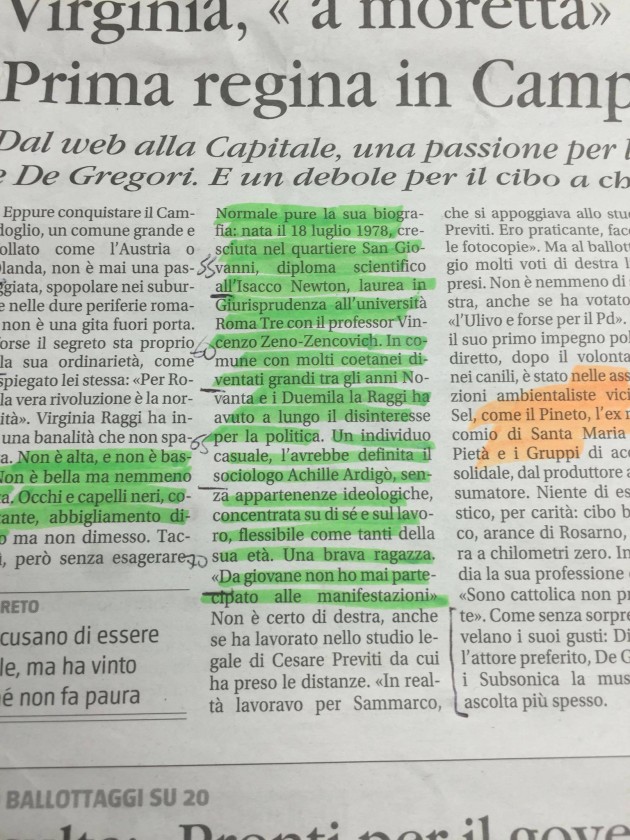 L’articolo in questione è stato pubblicato a pagina 2 (con richiamo in prima) di lunedì 20 giugno, all’indomani dei ballottaggi per le amministrative, ed è un ritratto dell’avvocatessa M5s eletta in Campidoglio. Due i passaggi in cui si concentra la replica dello stesso testo. Il primo, il più lungo, va da riga 50 a riga 71. Venti righe identiche. Dopo la descrizione fisica, Scafi ripercorre la biografia della sindaca e scrive: