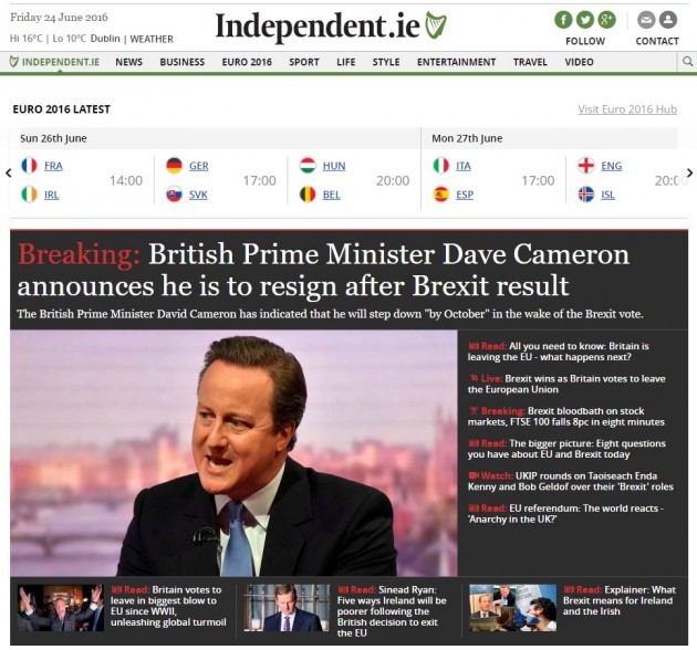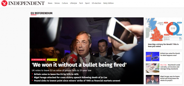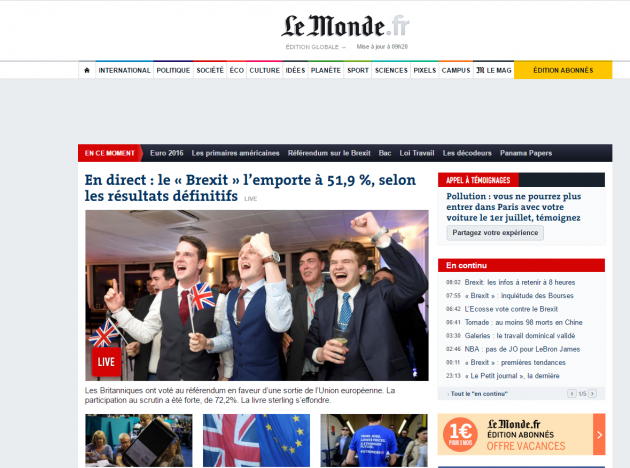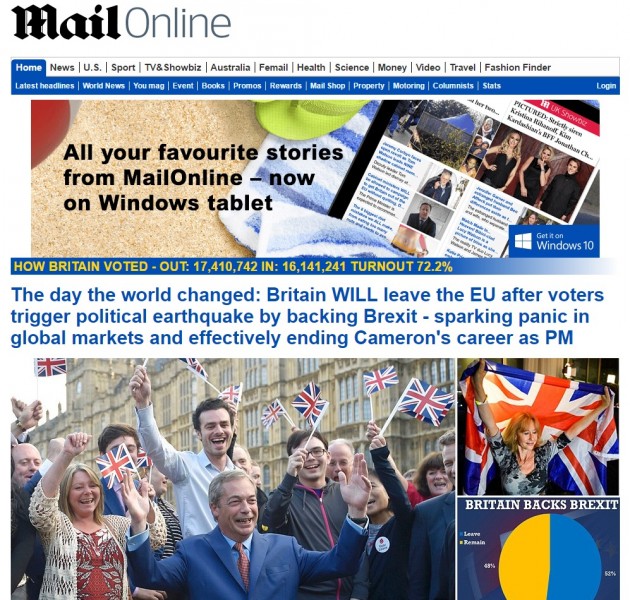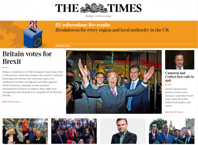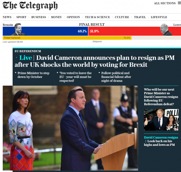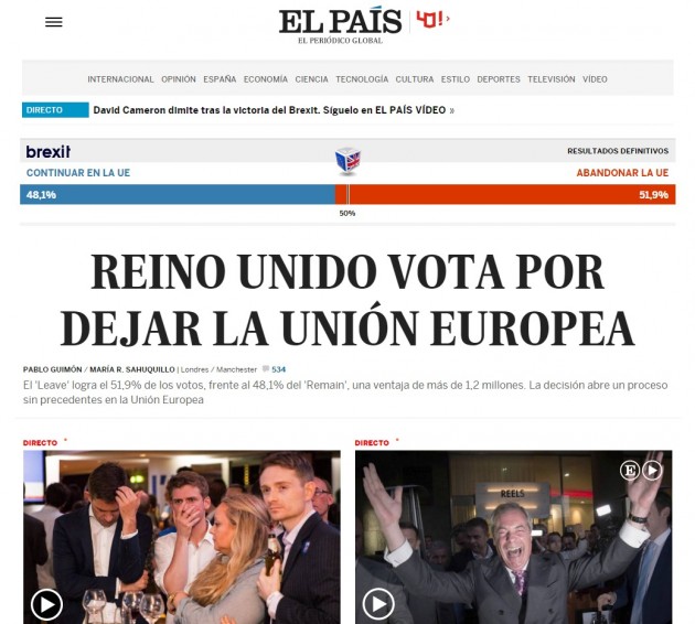 Tra i giornali britannici, invece, il Telegraph è quello che più ha sostenuto la campagna della Brexit: “Il Paese – scrive – ha avuto quella discussione aperta, e onesta, su sovranità, identità nazionale, rapporto con il resto del mondo e ovviamente immigrazione che da tempo gli era dovuta. Questo referendum deve essere fonte di orgoglio”. Su tutt’altra posizione è il Guardian, che per altro definisce la “caduta di David Cameron” una “tragedia europea”. Pessimisti anche gli altri giornali europei, dai francesi Le Figaro e Le Monde agli spagnoli El Mundo ed El Paìs, passando per il tedesco Spiegel e la versione irlandese dell’Indipendent.