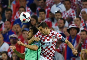 (160626) — LENS, June 26, 2016 (Xinhua) — Andre Gomes (L) of Portugal vies with Darijo Srna of Croatia during the Euro 2016 round of 16 soccer match between Portugal and Croatia in Lens, France, on June 25, 2016. (Xinhua/Tao Xiyi)