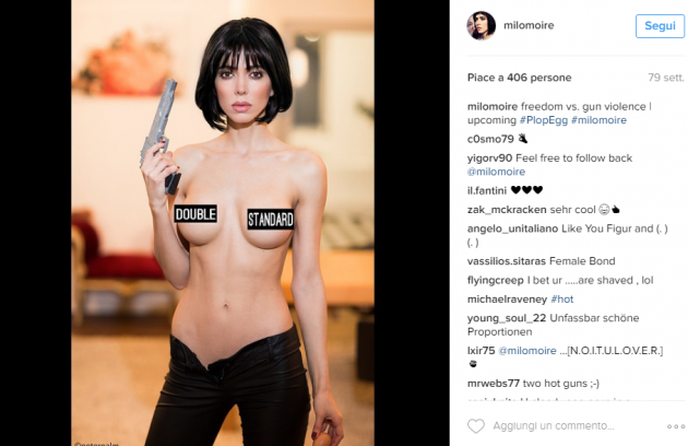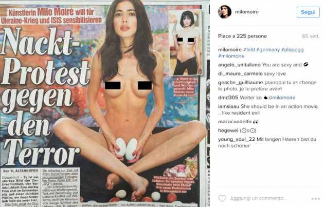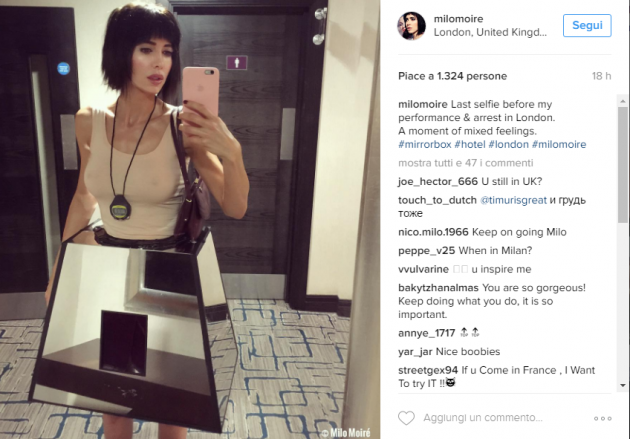 La performance si intitola Plop Egg, sottotiolo alla D.W. Griffith A Birth of a picture. Molti giornali inglesi l’hanno presa parecchio in giro, e sul Guardian se la sono pure ridacchiata rievocando le performance di arte contemporanea presenti ne La Grande Bellezza di Sorrentino. “L’estetica gioca un ruolo importante nella tecnica”, ha spiegato Moiré. “Io non vivo da eremita e non mi escludo della società”. Altro giro e altra nudità. Questa volta siamo al Trocadero di Parigi in mezzo ai turisti che si fotografano con sullo sfondo la Torre Eiffel. Lei è nuda e si fa fotografare di fianco ai turisti come fosse un’amica incontrata per caso. L’opera, se di opera si tratta, non ha titolo, ma l’arresto dei gendarmi è vero. Infine Trafalgar Square, il Mirror Box e ancora arresto e multa in sterline. Dicono che sia una protegè di Marina Abramovic. Intanto sul web fioccano i commenti. In parecchi contestano un aspetto evidente: i seni rifatti. Allora forse le performance di Milo Moiré qualche motivo di esistere ce l’hanno.