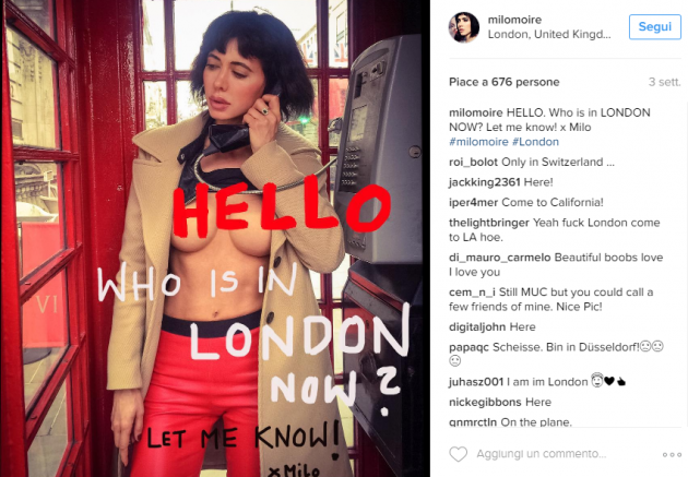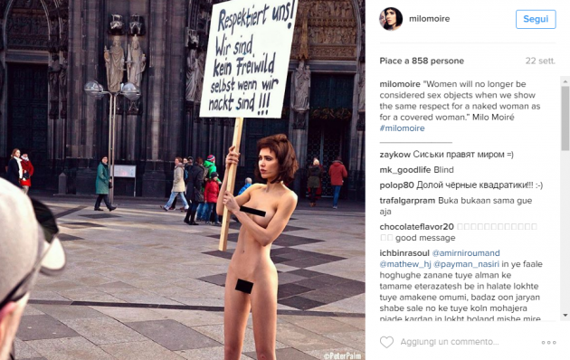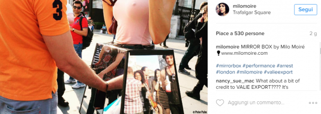 Rigorosamente sempre nuda. Se c’è un tratto distintivo della 33enne artista svizzera Milo Moiré, che qualche giorno fa con la sua performance The Mirror Box si è fatta titillare capezzoli e vagina dalle persone incontrate per strada a Londra, è quello di esibire un corpo da modella in tutta la sua originaria bellezza con una compostezza e rigore davvero encomiabili. Il proprio corpo senza veli mostrato in piazze, strade e cortili, in mezzo ai passanti. La ragazza, laureata in psicologia, ha iniziato con le sue performance outdoor nel 2013 e ne sono bastate un paio per far trasalire lo spettatore coinvolto, attirare riflettori del web e gestori di spazi museali, come a far incazzare la polizia. In principio fu The Script System numero 1. BelsenPlatz, Dusseldorf, tarda e fredda primavera. Alla fermata del tram appare Milo nuda, con l’aggiunta di occhiali e borsetta sulla spalla. Al posto dei vestiti sul corpo ha delle scritte in pennarello nero: “bra” sui seni, “jacket” sulle braccia, “t-shirt” sulla pancia, “Slip” sul pube, e “Pant” sulle cosce. Sale e scende dai bus. Non si registrano svenimenti o aggressioni verbali. Qualche sguardo però sì. Ma soprattutto una quantità di macchine fotografiche e smartphone a registrare frammenti di un’improvvisa apparizione on the road. Dietro all’operazione Script System c’è il fidanzato fotografo Peter Palm. Milo ripeterà l’esperimento nel 2014, questa volta a Basilea, e i risultati saranno pressoché identici.