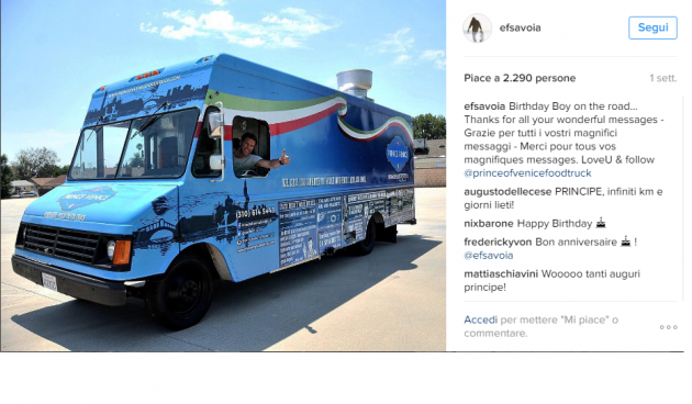 Ma ora l’erede di casa Savoia si reinventa come cuoco, come confessa lui stesso a Chi. Uno dice, farà lo chef di un lussuoso ristorante stellato. No: farà il cuoco sulle strade, più precisamente quelle californiane. Il principe starebbe battendo infatti le strade statunitensi con un furgone attrezzato a vera e propria cucina e sembrerebbe che il nobile piemontese non stia sulle retrovie, ma in prima linea, con padelle e ingredienti in mano. Con lui c’è lo chef Mirko Paderno che ha già lavorato nel nuovo continente per l’Avalon, a Beverly Hills.
