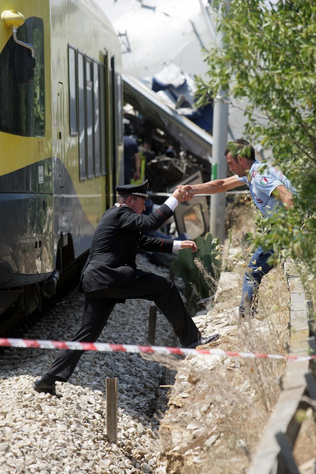 Intanto entrambi i macchinisti sono stati identificati: dopo il riconoscimento di Pasquale Abbasciano di Andria, i resti umani trovati a bordo del convoglio giallo – quello proveniente da Bari -appartengono a Luciano Caterino, 37 anni, originario di Corato. L’uomo nell’impatto è rimasto dilaniato. L’equipaggio dei due treni era composto da un macchinista e da un capotreno per ogni convoglio.