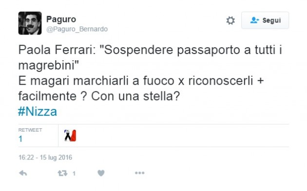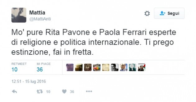 Loro fanno a pezzi donne e bambini e noi rispondiamo con le cerbottane. — paola ferrari (@paolaferrari_og) 15 luglio 2016