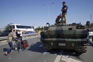 A man looks from atop a military vehicle as a woman passes by, in front of Sabiha Airport, in Istanbul, Turkey July 16, 2016. REUTERS/Baz Ratner