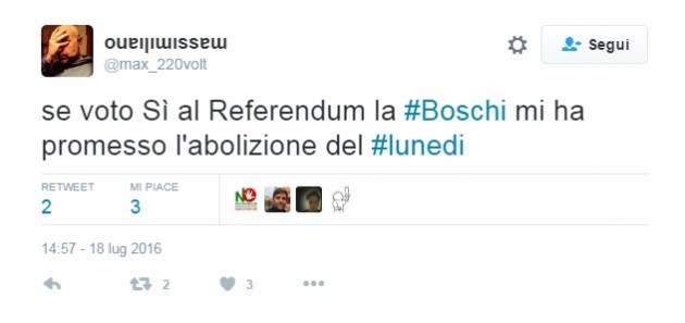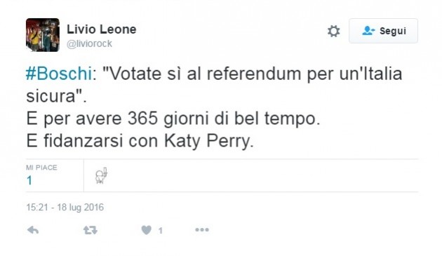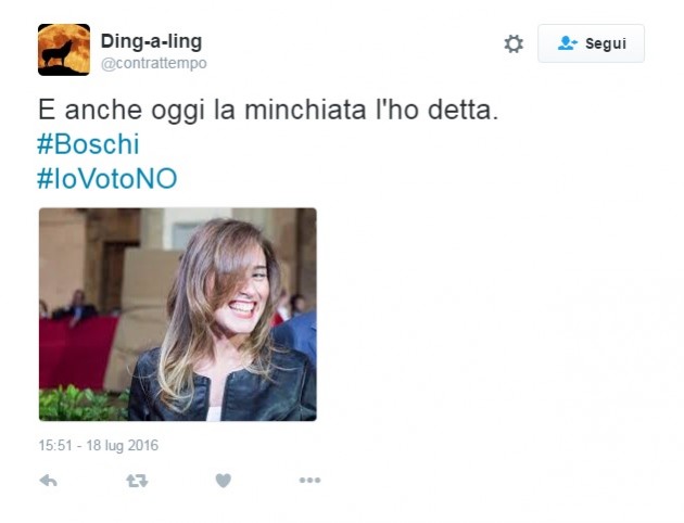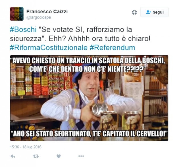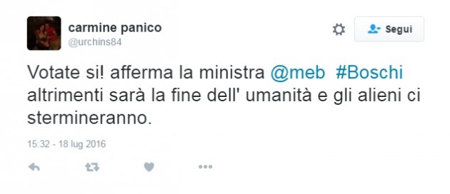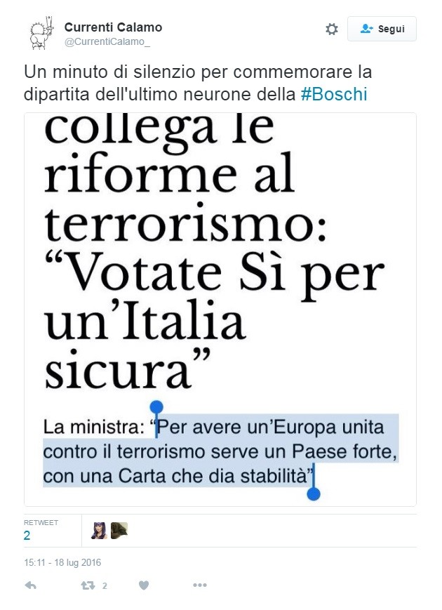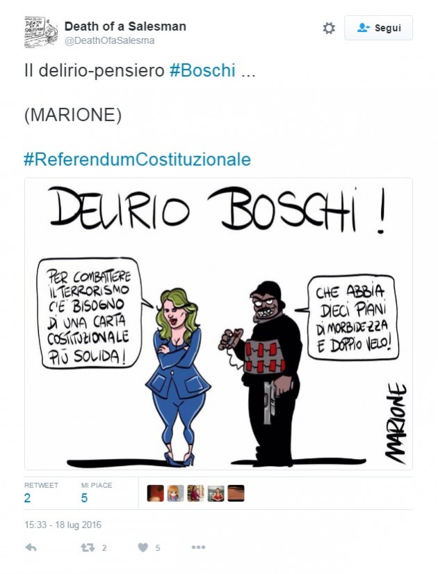 Il collegamento tra la riforma della Carta e l’emergenza sicurezza ha scatenato gli utenti in rete tra prese in giro, attacchi e derisioni di ogni tipo. A decine hanno dato sfogo alla propria fantasia, immaginando quante cose, quanti miracoli, potrebbero essere realizzati nel caso in cui vinca il Sì al referendum. Al “gioco” hanno partecipato così tante persone da far entrare la parola “Boschi” tra i trending topics del social network.