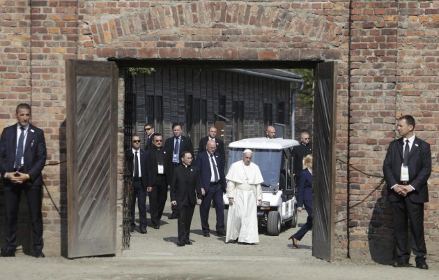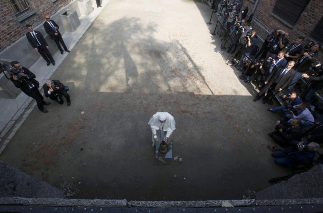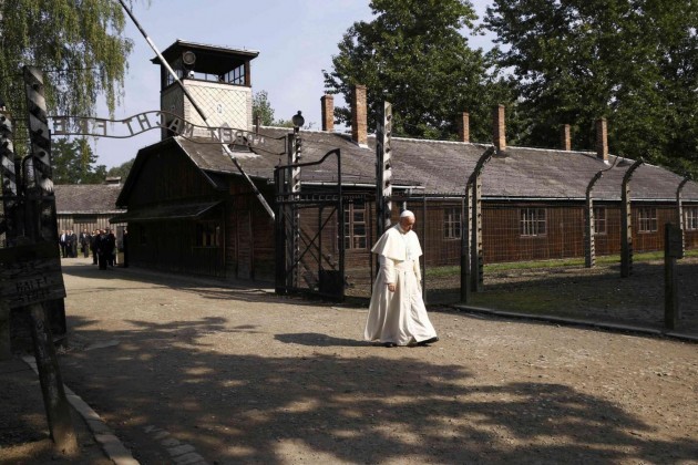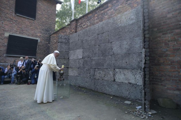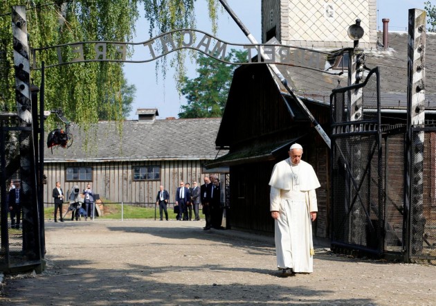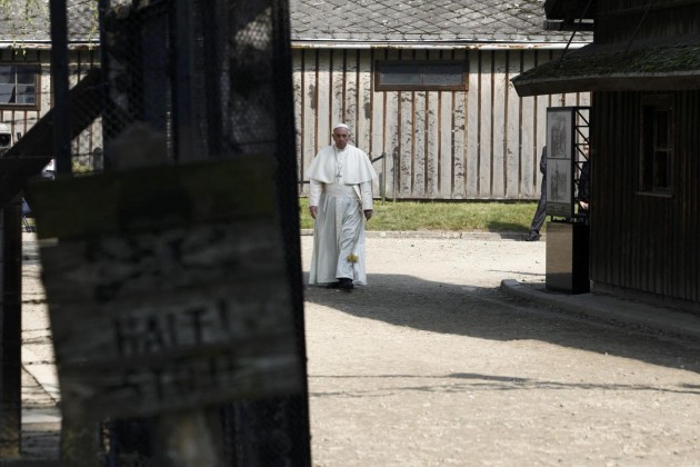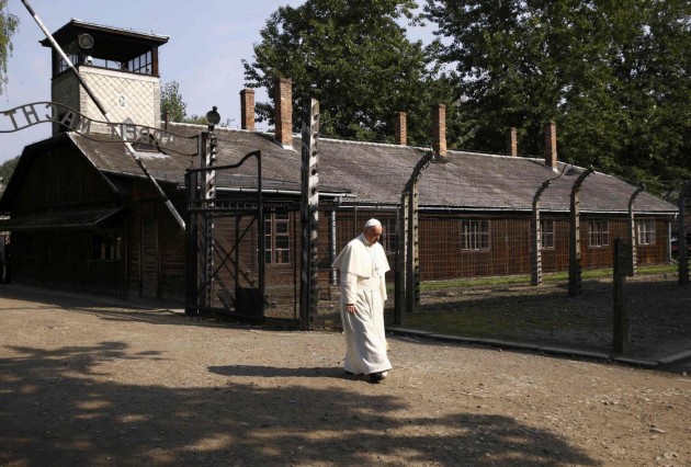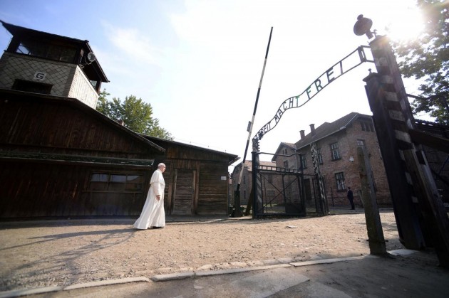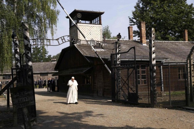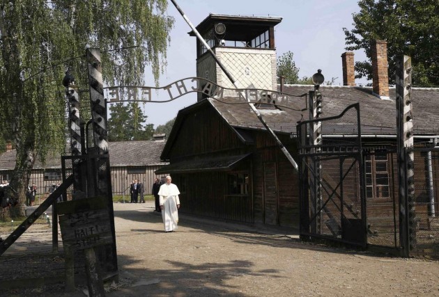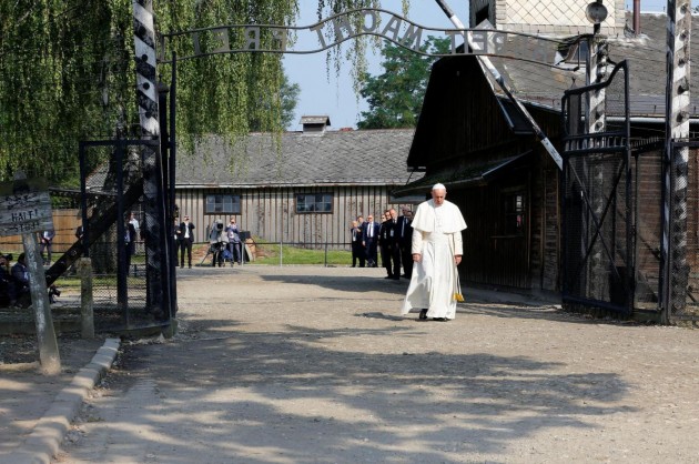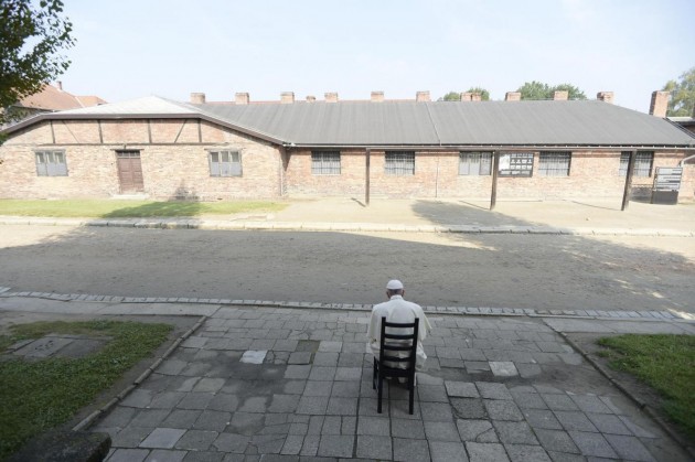 Ha attraversato da solo l’arco d’ingresso del campo di Auschwitz, con il capo chino e in silenzio. E’ passato sotto la scritta ‘Arbeit macht frei’ (Il lavoro rende liberi). Poi si è seduto su una sedia con le mani giunte, e ha pregato per diversi minuti nella piazza dell’appello. Il luogo dove avvenivano le impiccagioni dei prigionieri, accanto al muro della morte, dove gli internati venivano fucilati. Papa Francesco è arrivato nel campo di sterminio nazista ad Oswiecim, a circa 70 chilometri da Cracovia dove si svolge la Giornata mondiale della gioventù, intorno alle 9 e 30. Ha scelto di non pronunciare discorsi nel luogo simbolo dell’Olocausto. Ma ha voluto lasciare un messaggio: “Signore, abbi pietà del tuo popolo! Signore, perdona tanta crudeltà“. Una frase scritta in spagnolo diffusa con un tweet dal Museo Memoriale di Auschwitz.