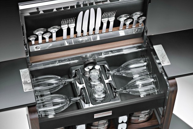 D’accordo, è pur sempre un picnic da ricchi. Ma 38 mila dollari (33.500 euro circa) per banchettare su un prato a pochi metri dalla propria Rolls Royce Phantom Zenith Collection, seppur con un “cesto” in legno di noce americano e pelle grana naturale, forse è un tantino troppo. Comunque sia, visto che non c’è limite al vezzo di chi se lo può permettere, questo è uno dei cinquanta accessori realizzati rigorosamente a mano dalla divisione Bespoke (quella che si occupa delle personalizzazioni) della casa di lusso inglese. Pelle e legno in abbondanza anche per la scaffalatura interna, che contiene bicchieri da vino in cristallo e piombo, posate fatte a mano in acciaio inox, tovaglioli ricamati con la scritta “Rolls-Royce” e un tagliere artigianale in noce americano. E raffinate stoviglie con dettagli in nero e platino sui bordi. Com’era lecito attendersi, infine, si tratta di un accessorio a tiratura limitata: ne verranno prodotti solo 50 e ognuno di questi avrà sopra una placca ben visibile col numero d’appartenenza.