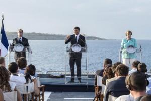 Foto Roberto Monaldo / LaPresse22-08-2016 Ventotene (Lt)PoliticaVertice Italia – Francia- GermaniaNella foto Francois Hollande, Angela Merkel, Matteo RenziPhoto Roberto Monaldo / LaPresse22-08-2016 Ventotene (Italy)Summit Italy – France- GermanyIn the photo Francois Hollande, Angela Merkel, Matteo Renzi
