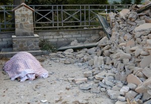 A body is covered by cloth next to rubble following a quake in Amatrice, central Italy, August 24, 2016. REUTERS/Remo Casilli