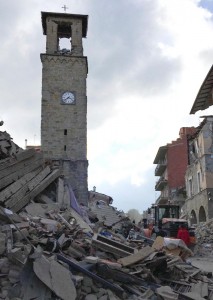 The partially damaged tower bell with the clock signing the time of the earthquake is seen in Amatrice, central Italy, August 24, 2016. REUTERS/Emiliano Grillotti FOR EDITORIAL USE ONLY. NO RESALES. NO ARCHIVES.