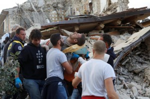 A man is carried away after been rescued alive from the ruins following an earthquake in Amatrice, central Italy, August 24, 2016. REUTERS/Remo Casilli