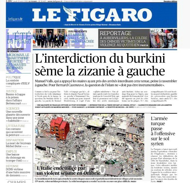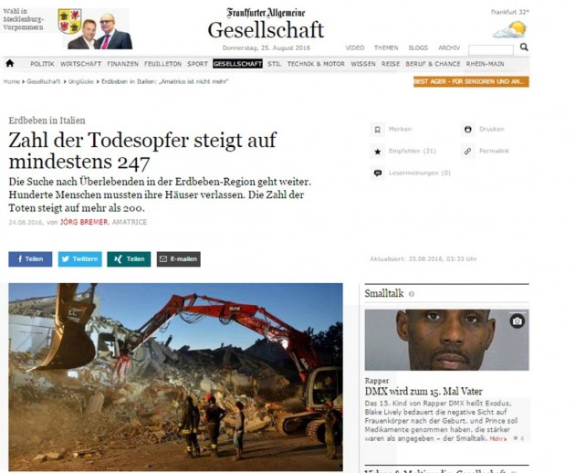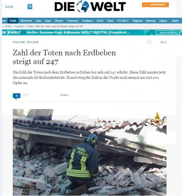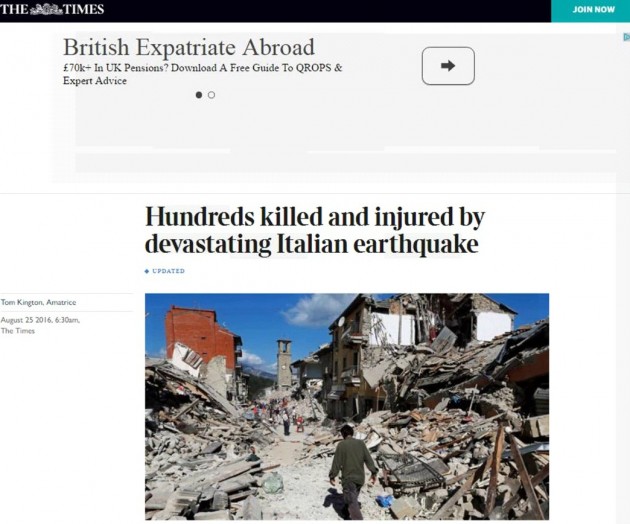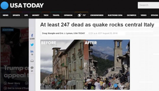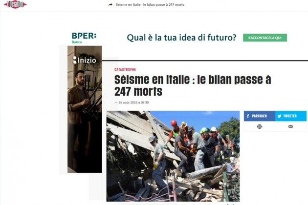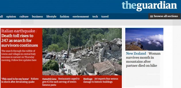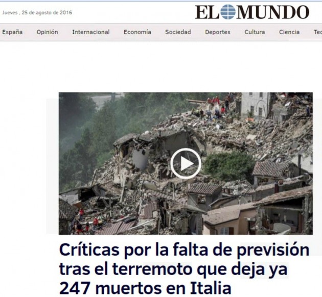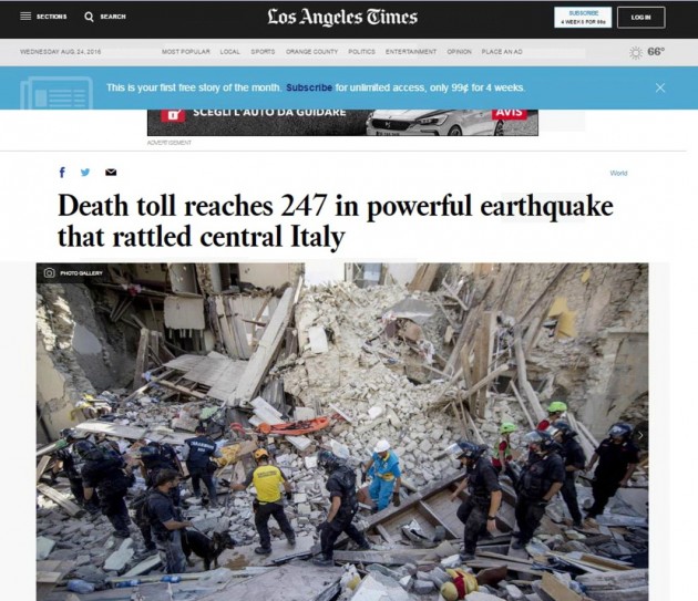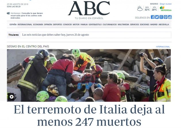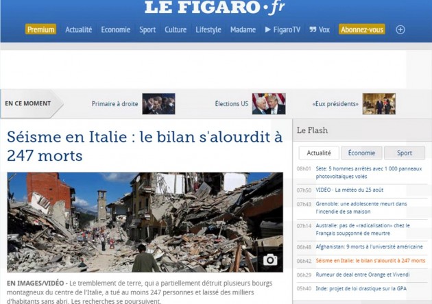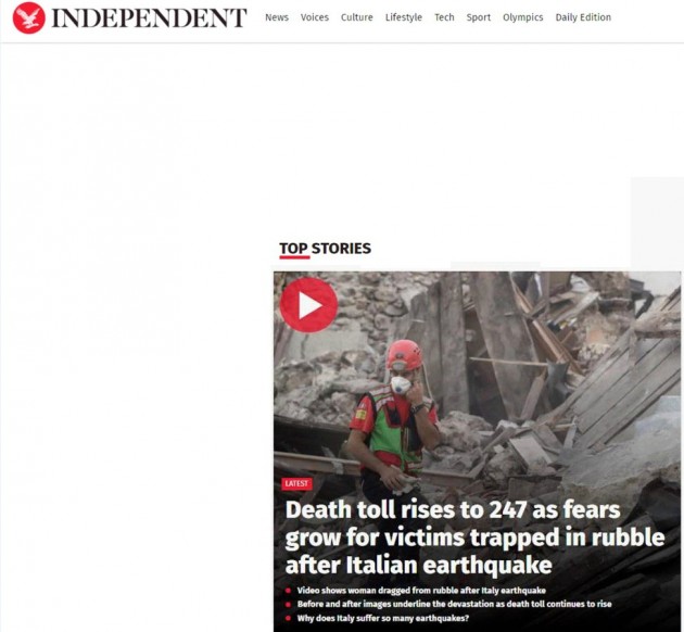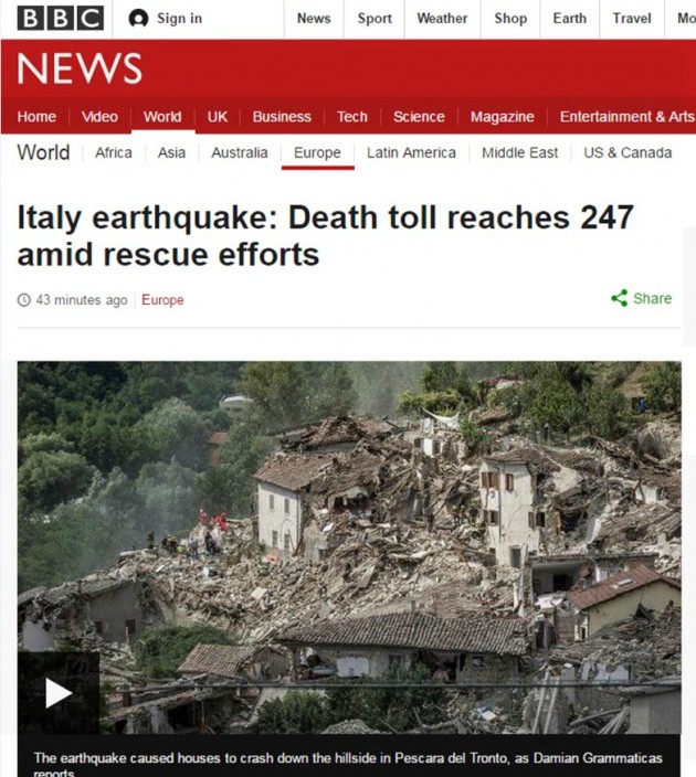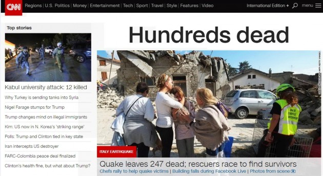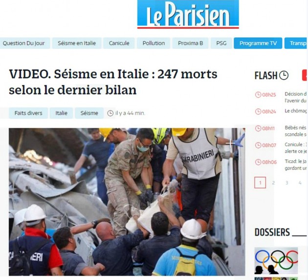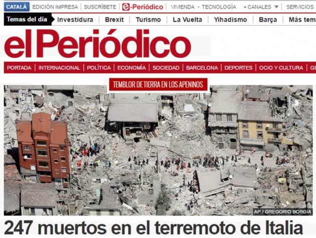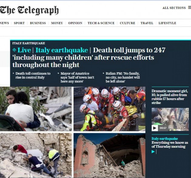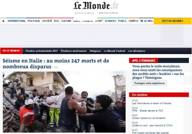 Dal Washington Post al New York Times, da El Pais a Le Figaro fino al Financial Times. Tutti i principali quotidiani e siti online del mondo hanno deciso di dedicare l’apertura al terremoto di magnitudo 6.0 che mercoledì mattina, alle 3 e 36, ha colpito il Centro Italia uccidendo oltre 240 persone e distruggendo i paesi di Amatrice e Accumoli, in provincia di Rieti, Arquata, in provincia di Ascoli Piceno, e la sua frazione Pescara del Tronto. Su tutti i media internazionali sono state pubblicate le foptografie, i video e le storie che raccontano la portata della catastrofe.