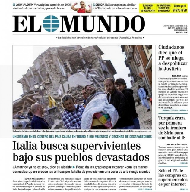 “Terremoto devasta l’Italia centrale”, è il titolo di apertura del britannico Financial Times. “Italia ferita” è, invece, la prima pagina di Le Monde. Il New York Times “Terremoto colpisce l’Italia, spianando paesi e uccidendo centinaia di persone”. “Un sisma devastante uccide 120 persone”, è il titolo in prima pagina sul britannico Guardian accompagnato da una grande foto dei soccorritori impegnati ad estrarre sopravvissuti dalle macerie ad Amatrice. Stessa foto e stesso titolo, “Terremoto uccide più di 100 persone in Italia”, per l’americano per il Wall Street Journal. “E’ un dramma, il paese non esiste più”, è l’apertura di El Pais che cita le toccanti parole del sindaco di Amatrice.