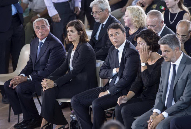 Presenti ai funerali anche il premier Matteo Renzi con la moglie Agnese, visibilmente commossa, i presidenti di Camera e Senato, Laura Boldrini e Pietro Grasso, e il vicepresidente della Camera, Luigi Di Maio. I funerali religiosi delle vittime di Amatrice e Accumoli si svolgeranno martedì alle 18. A Roma e Pomezia si sono già tenuti alcuni riti privati.
