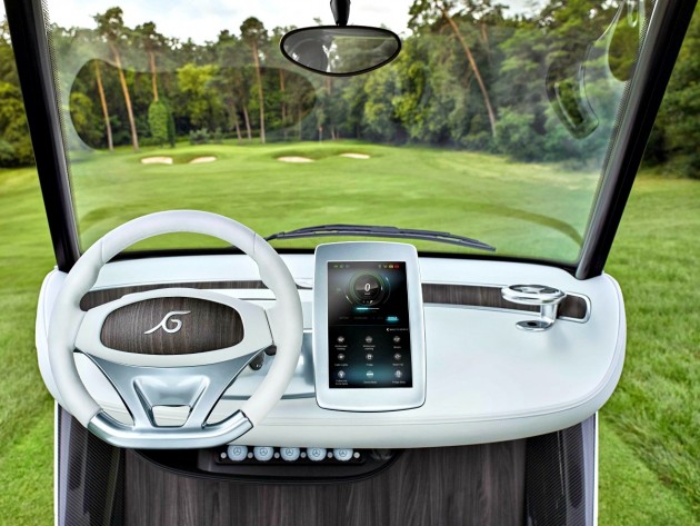 “A bordo” spicca un touchpad da 10,1 pollici ad alta risoluzione – 2.560 x 1.600 pixel – che permette di visualizzare le informazioni sul veicolo (autonomia residua, velocità di marcia, consumo di corrente istantaneo, etc) e consente al contempo di gestire numerose funzioni, tra cui la modalità di marcia Sport (!), i fari, lo sbrinatore del parabrezza, o i tergicristalli. Inoltre tramite il pannello si possono richiamare la planimetria del campo da golf, la posizione GPS del cart o tenere il conto dei punti.